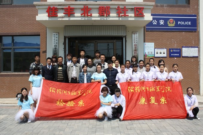 2015年5月15日上午9时,检验技术系、康复系的师生走进了铁岭市银州区铜钟街道佳丰北郡社区,开展“职业教育活动周”传统教育进社区、卫生保健送健康活动,康复系书记孟繁明、检验技术系书记徐宁、康复系辅导员孙丽丽、检验系辅导员徐万鹏,两个系共计三十余名同学参加了本次活动。