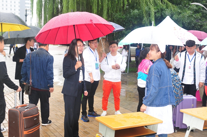 报到现场,工作人员紧张有序地开展各项工作。迎新服务车抵达校园后,学生志愿者们立即帮助新生运送行李,各院系老师和学生志愿者们在现场引导新生办理入学手续,咨询台、报到处、缴费、领取物品等处标语清晰,位置安排合理,家长休息区、茶水间、播音台、医疗站等服务设施一应俱全,为新生及家长提供热情、周到、温馨的服务。