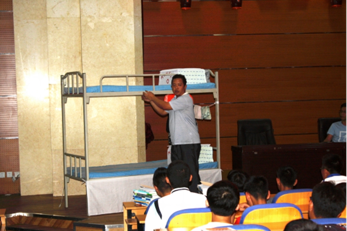 活动中,郑亚洲处长和孟飞副处长对新生进行了寝室文明和公寓日常行为规范教育,并由舍务老师和学生干部现场进行了内务整理的示范操作,充分发挥了学生干部传、帮、带的优秀传统,起到了良好的教育和示范作用,为文明寝室建设打下了扎实的基础。