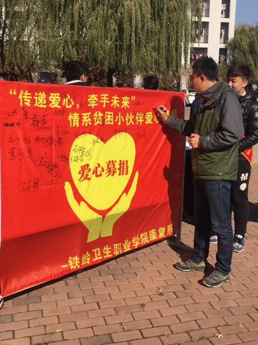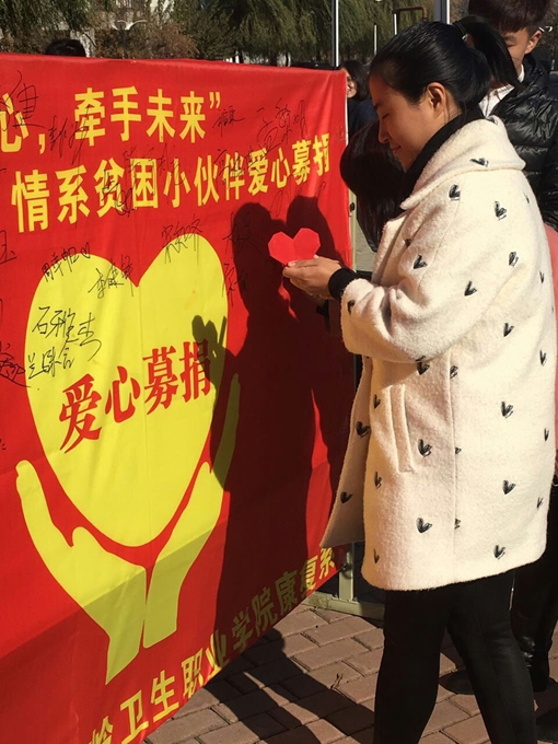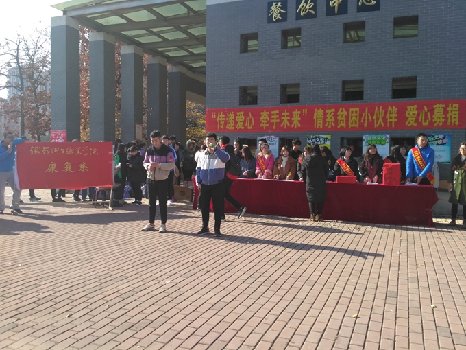 2016年10月17日为我国的第三个扶贫日,也是第24个国际消除贫困日,为了更好的实施精准扶贫精准脱贫基本方略携手消除贫困,促进共同发展。2016年11月2日中午11:30在我院餐饮中心门前,我院康复系志愿者服务队组织举办了“传递爱心,牵手未来”情系贫困小伙伴爱心募捐活动。