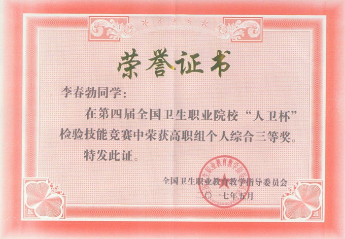 2017年5月26日至28日,在全国卫生职业教育教学指导委员会主办的第四届全国卫生职业院校“人卫杯”检验技能竞赛(高职组)中,我院医学检验系周子豪、李春勃两名同学获个人综合三等奖,王佳美获个人综合优秀奖。